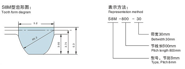 三个部分:指示带的长度,间距和宽度带回来的部分号码。如下图所示。此S8M橡胶单面齿同步带型号,节线长为800mm,带宽为30mm。